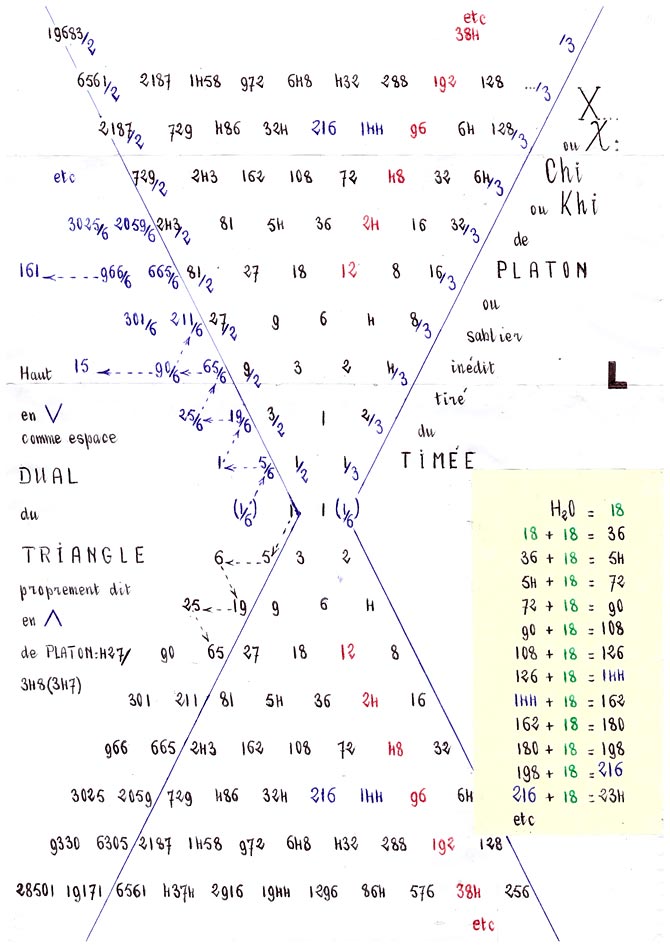 EN CONCLUSION, les nombres 216, 144(10), 144, qui sont quelquefois intangibles ou récurrents ailleurs aux Fig.F, G(Ia), H(IIa), I(IIIa/b), J(IVa/b), K(Va/b), s'accolent 2 fois en doublets (144, 216) au sablier que nous nommons aussi X de Platon où — Fig.L, tant au dual du triangle qu’au triangle proprement dit du TIMEE de Platon — à la 2e oblique en bas et à la 3e oblique en haut progressant numériquement vers la droite se retrouve encore la suite ou série ou séquence A000049 de OEIS.